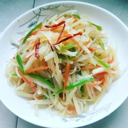 Potatoes ( 3 (small ones) ) | Edible oil, green pepper, Carrots, pepper powder, salt, chicken essence, light soy sauce, vinegar, dried red pepper shreds (appropriate amount) |