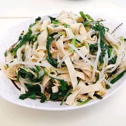 7. Stir-fry the bean sprouts until soft, add the tofu skin and stir-fry quickly