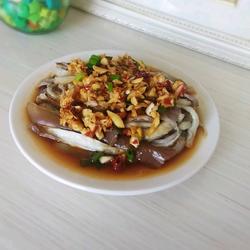 5.Put the minced garlic, millet pepper, and chopped green onion into a bowl, then add a spoonful of chili sauce, salt, light soy sauce, white vinegar, and sesame oil.Add a little boiling water to dissolve the peppers, stir well and set aside.