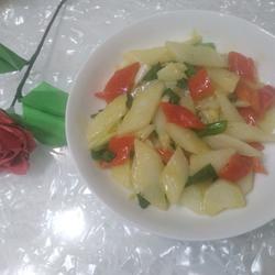 5.Add red pepper and garlic leaves, stir-fry a few times, and you are ready to serve