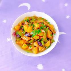 13. Immediately add eggplant, green pepper, and potatoes and stir-fry