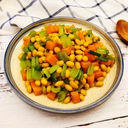 9. Add celery, carrots and cooked soybeans and stir-fry for one minute.