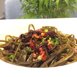3.Sprinkle minced chives and dried chili peppers on the kelp;