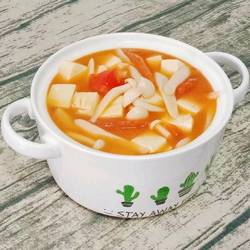 13.A stewed tofu with tomatoes and white mushrooms is ready