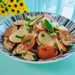 2. Cut dried tofu into lingjiao, slice wild rice, slice carrots, slice green peppers, slice mushrooms, Dice green onion