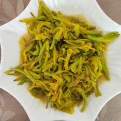 5.Heat the oil in a pan with cold oil until it is 70% hot.Add yellow flowers, salt, chicken essence, sugar, a little oil, stir-fry evenly and remove from the pan.