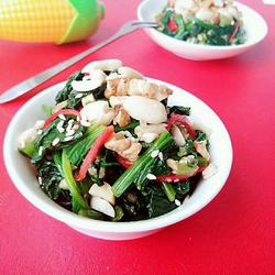 6.Add shredded pepper and minced garlic to the spinach, then add nuts,