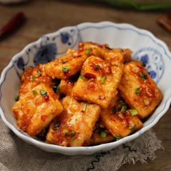 The tofu should be northern tofu, which is relatively strong.When fried, the starch-coated tofu will not break easily, and it will also make the tofu taste better.The chopped chili sauce I use has a sweet and sour taste, with only a little spiciness, so I put more of it.You have to control the amount according to the chopped chili sauce you use, and the sauce can also be adjusted according to your own taste.of.