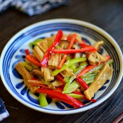 2. Soak the yuba for three hours, then boil it in boiling water until soft, and boil the mushrooms in boiling water as well.Blanch it, mince green onion, mince garlic, cut yuba into sections, slice mushrooms, shred green and red peppers