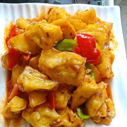 6.Eggplant Fry in batter (low oil temperature until cooked, high oil temperature until crispy and golden), green and red peppers in oil