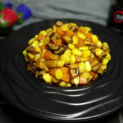 6. Add corn and stir-fry, add a few soaked mushrooms Water
