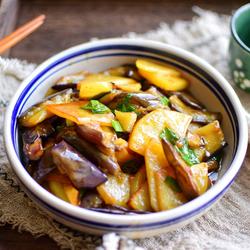 3. Heat the oil in the pot, add the potato slices and fry until cooked, place on a plate and set aside4.Add appropriate amount of oil, add eggplant and fry until cooked