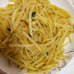 3.Put oil in the pot, add chopped green onion and shredded potatoes, and stir-fry.