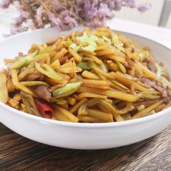 12. When the shredded potatoes are soft, add the blanched beans and stir-fry.