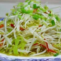 3. Heat oil 60% to 70% hot, stir-fry shredded ginger, green onion, star anise, pepper, red pepper, green pepper and salt.If the aroma is fragrant, pour the bean sprouts into the pot and stir-fry until soft