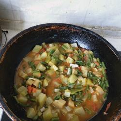 5.Put in the eggplant and beans, followed by the tomatoes, otherwise the eggplant will easily turn black.