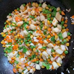 1.Dice yam and carrot.Thaw peas.My corn is canned and doesn’t need processing.