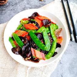 Add the snow peas and fungus.You don’t need to fry them for too long.They have been blanched and are cooked.