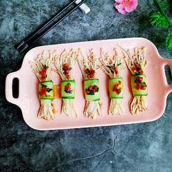 6.Use thin slices of cucumber to roll up the enoki mushrooms and place them on a plate