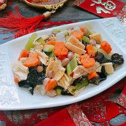 6. Blanch celery, carrots and lotus roots together in water.When blanch, add an appropriate amount of oil to make them green.Blanch the cucumbers and cut them into pieces.Blanch them for 30 seconds and take them out to keep the cucumbers crispy.