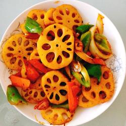 3. Add lotus root slices and stir-fry, add appropriate amount of light soy sauce, salt, thirteen spices, add green pepper, Stir-fry the carrots and add appropriate amount of sugar