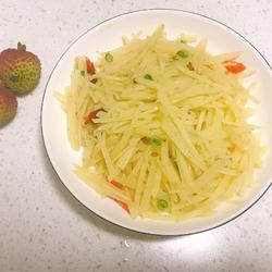 4. Heat the oil in a pan, add the minced garlic and red pepper and stir-fry for 10 seconds.Add the shredded potatoes and stir-fry for 10 seconds.Add an appropriate amount of salt, add white vinegar and stir-fry.Stir-fry for 2 minutes and sprinkle with chopped green onions before serving out