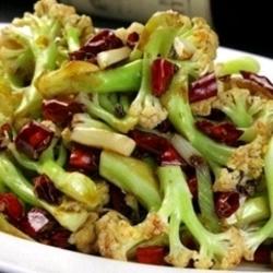 2. Heat 50% oil in a pot, stir-fry the minced garlic first, then add diced dried chili peppers, over low heat Saute until fragrant, then quickly add appropriate amount of rice vinegar and soy sauce.Then add an appropriate amount of cauliflower and stir-fry over low heat, add white sugar, and a little MSG and chicken essence to taste