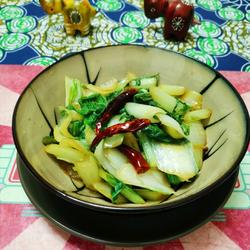Heat the pot with cold oil, add Sichuan peppercorns, crushed garlic cloves, three chili peppers, and chopped green onions in sequence.Stir fry the cabbage sticks first; then add the cabbage leaves and let them change color slightly.Cover the pot and simmer for five minutes.Six minutes.