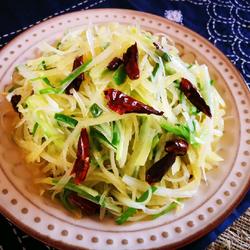 6.Add potato shreds, add a little white sugar, white vinegar and salt and stir-fry over high heat.
