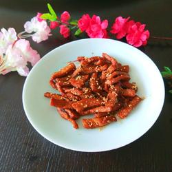 10. Add chili powder, white sesame seeds, stir-fry quickly, and pour Add the fried meat strips, stir-fry the chicken essence and serve.