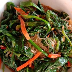 1.Cook the washed spinach in cold water, soak the vermicelli in boiling water, peel and shred the carrots, cut off the millet and put it into a bowl for later use