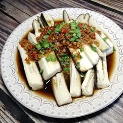 9. Pour the minced garlic and soup onto the eggplant, and then Steam for two minutes