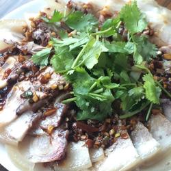 6.After completely cooled, remove and cut into thin slices and serve on a plate.Put all other seasonings together in a bowl and mix into a uniform mixture.Pour the juice over the elbow meat slices and garnish with some coriander.