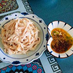 1.Put chicken breasts into a pot under cold water.After boiling, skim off the foam and add onions, ginger and white wine.