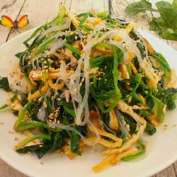 4. Remove the water from the vermicelli that is too cool and squeeze the spinach a little water, fried tofu leaves and cut into thin strips.Take a small bowl, put mustard salt, sweet and sour sesame oil chicken essence, and add some water to make a sauce
