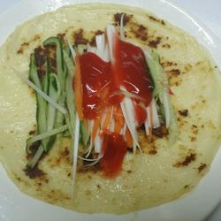 3. Spread 10% doenjang on the surface of the pancake and sprinkle the three shreds on the doenjang.Just a little tomato sauce