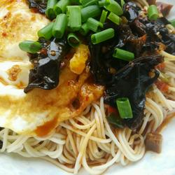 5.Plate noodles, eggs, fungus and chopped green onion.