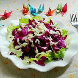 4.Pour the salad dressing into a piping bag and use a small round piping nozzle to transfer the salad dressing Squeeze over purple cabbage and serve.