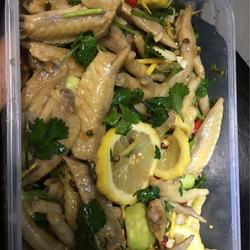 3.Put cold water into the pot, add chicken feet and chicken tips, then add ginger slices, two tablespoons of rice wine, a handful of Sichuan peppercorns, and cook over medium heat for 10 minutes.Rinse with cold water, drain and set aside