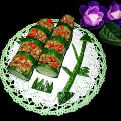 9.Put the minced meat into the cucumber cup.