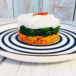 4. Drain the three ingredients into cold water and squeeze them dry to remove the moisture.Place the layers layer by layer in the round mold and press tightly.