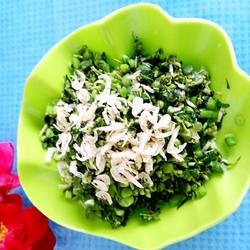 7. Let cool and chop into pieces, chop the garlic sprouts, sprinkle with salt, and pour in sesame oil , the taste is very fresh, and sprinkled with some dried shrimps, it tastes very good,