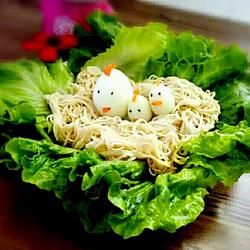 4. Arrange the vegetables around the plate, chicken The shaped eggs are placed in the middle of the noodles