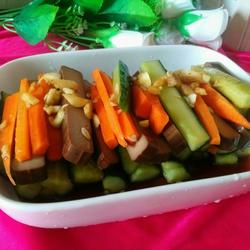 4.Put the cucumbers, dried beans, and carrots into a large bowl, and add the minced garlic