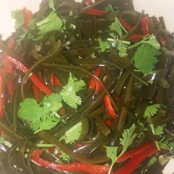 5.Pour the cooked kelp shreds into cold water Add the selected sauce and mix well, add shredded red pepper and coriander and mix well, the deliciousness is ready