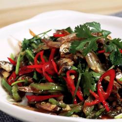 3. Heat the oil in the pot, pour in the dried petrel fish and shredded green and red peppers and fry for 30 Remove after seconds.