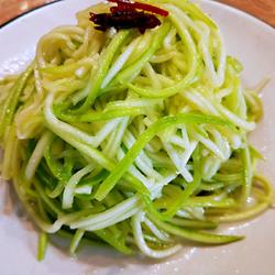 2. Boil the water to 80 degrees.I use an electric kettle and pour in the cucurbit silk before it jumps.inside.Boiling water at 100 degrees will make the zucchini shreds soft and not straight.You can also mix it directly without boiling the water, but the children at home are very picky and don't eat raw food, so I just cook it raw without affecting the crispy taste.