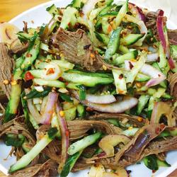 4. Cut the cucumber into thin strips and shred the onion and set aside.