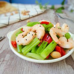 6.Put the shrimp, celery, peanuts and red pepper into a large bowl