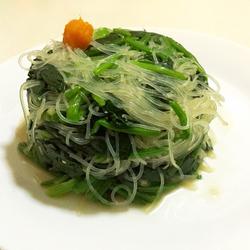 1.Spinach is fresh and cheap these days, only one yuan Bought so much! Cut into four sections, blanch in boiling water, add oil and salt for 30 seconds, take out and put them together with the soaked vermicelli.